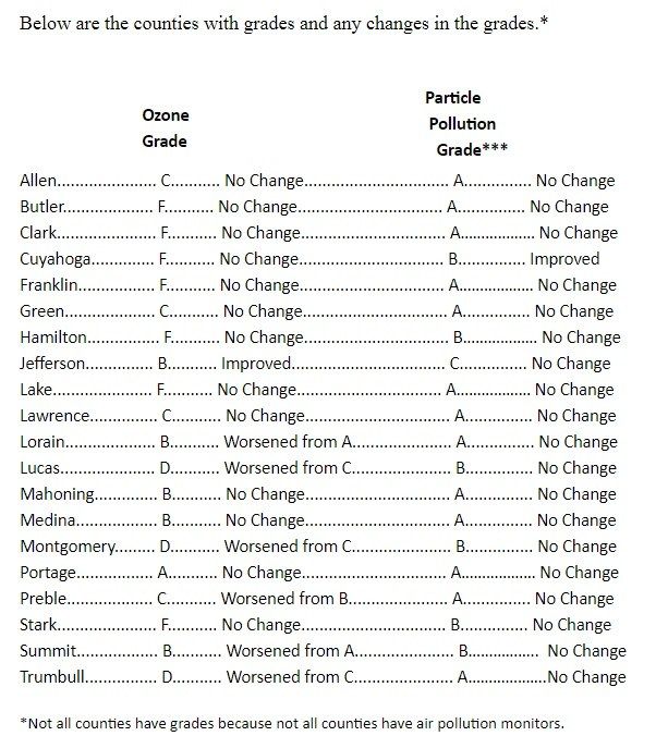 A report card on air quality shows that ozone levels have worsened in Trumbull County.