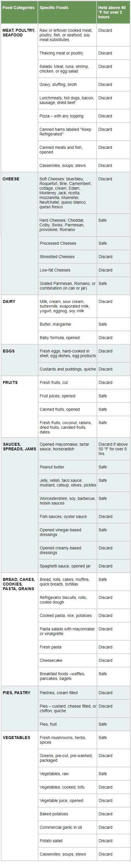 Throw out any perishable food such as meat, poultry, fish, eggs, and leftovers that have been above 40 degrees for more than two hours.