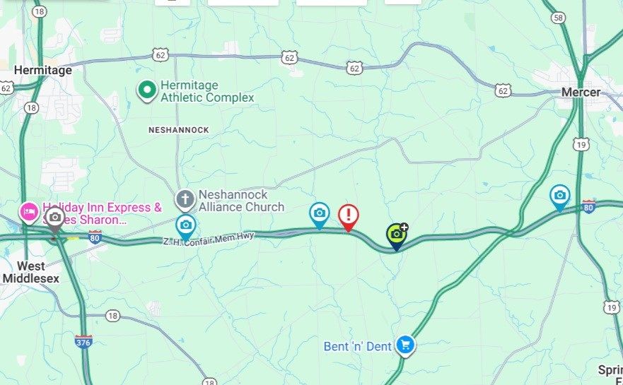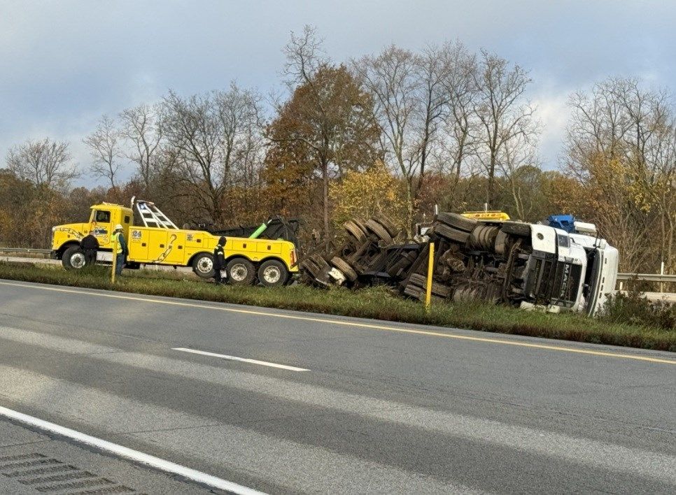 The crash occurred around 7:53 a.m. near mile marker 10.0 in Lackawannock Township, about six miles west of the Mercer Exit. The big rig flipped onto its side, spilling its purple cargo along the roadside.
