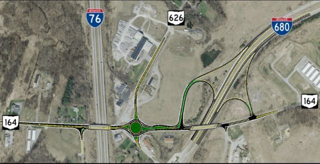 The roundabout will be located at the intersection of SR 164 and Route 626 between I-680 and the turnpike.