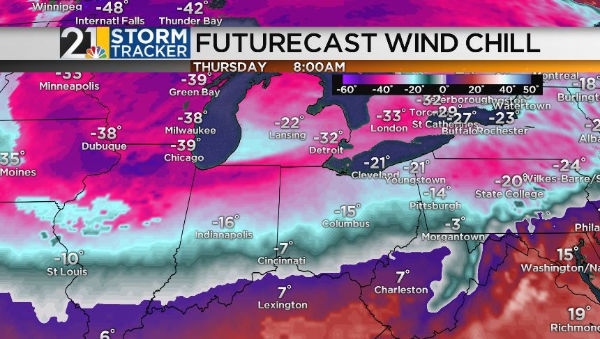 We'll also challenge some record lows mid-week; a bit less windy Thursday but still frigid with highs near 0 and lows in the single digits below 0.