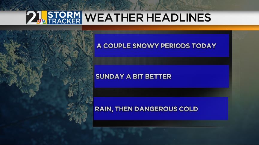 Snow showers will continue through late morning with little additional accumulation; watch for slick spots! Look for a high of 25 and a low of 21 tonight as more light snow moves in around midnight. An additional inch is possible by daybreak Sunday. Lingering flurries Sunday morning followed by mostly cloudy skies during the day and a high of 29. After some clearing late Sunday night and Monday morning, skies turn mostly cloudy again late in the day with rain arriving - possibly sta...