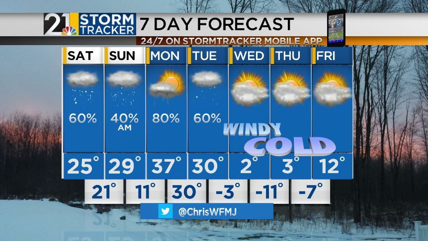 Look for a high of 25 and a low of 21 tonight as more light snow moves in around midnight. An additional inch is possible by daybreak Sunday.