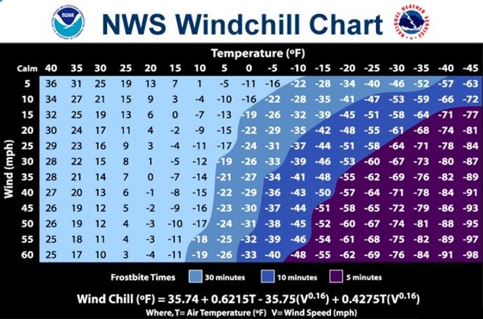 The calculation utilizes wind speed in miles per hour and temperature in degrees Fahrenheit. For example, a temperature of minus five degrees occurring with a 20 mph wind gives a wind chill near minus 30 degrees (see wind chill calculation table below). This means that your body will lose heat at the same rate as it would if the air temperature were minus 30 degrees with no wind. Wind chill values near minus 25 degrees mean that frostbite is possible within 15 minutes.