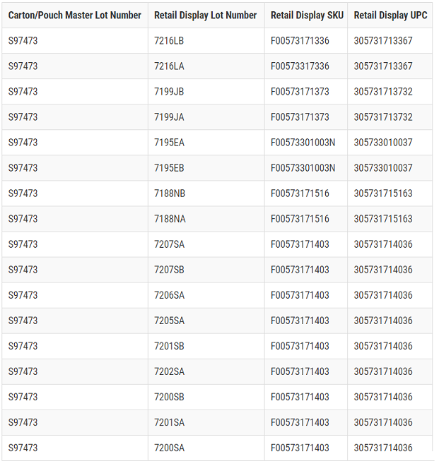 This master lot and display case sub lots were distributed nationwide to retailers, wholesalers, and distributors in the United States and Puerto Rico from June 2017 through March 2018.