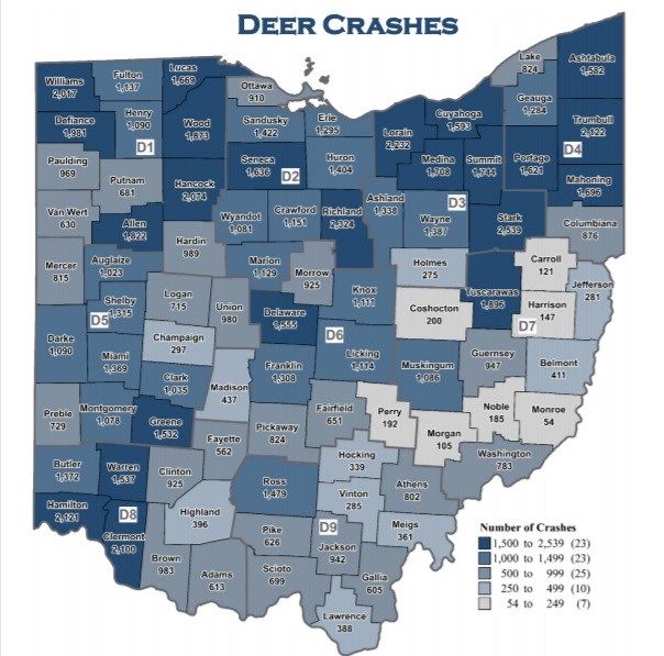 In 2019, statistics from the Ohio State Highway Patrol show there were 19,375 deer-related crashes on Ohio's roadways. Of those crashes, four resulted in fatal injuries to motorists, and 966 people were injured.
