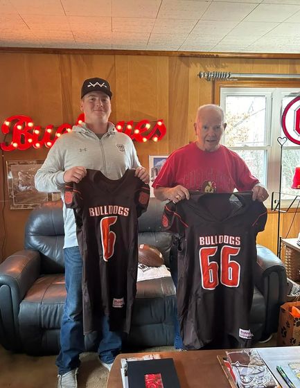 The two met at Linder's home in Athens, Ohio, and Owen presented him with an updated version of the number 66 jersey Linder wore in high school.