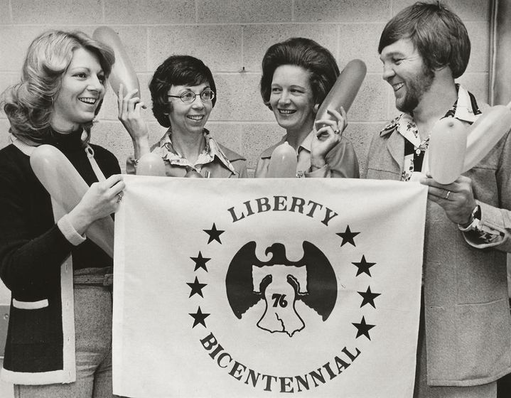 21 WFMJ archives / February 14, 1976 | Liberty Township officially launched its Bicentennial observance 49 years ago. Holding the township's official flag were Mrs. Carol DeFrank, committee publicity chairman; Mrs. Donna Gereb, general chairman; Mrs. Marcio Soares, decoration committee; and Philip Adler, township trustee.