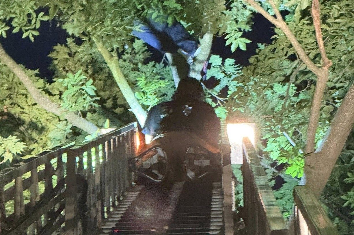 The pilot was found suspended about 50 to 60 feet above the ground, according to the fire department’s social media post.