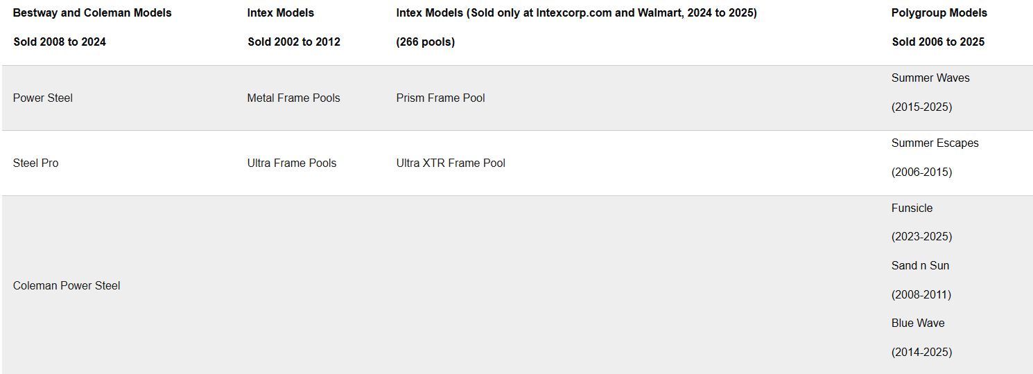 Pool models of 48 inches or taller that are included in the recall include the following, found on the CPSC recall alert: