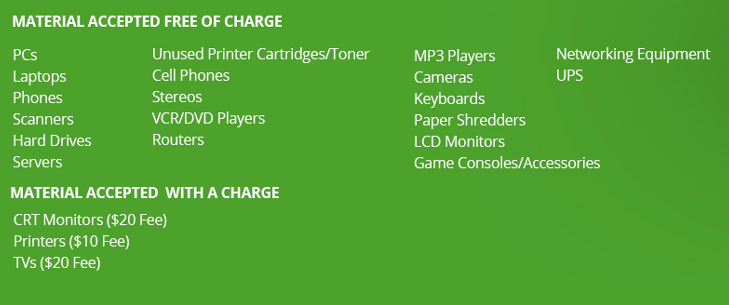 Dozens of electronics can be dropped off at the site including PCs, laptops, phones, routers, paper shredders and more. Other items including CRT Monitors, printers and TVs can be discarded for a price.