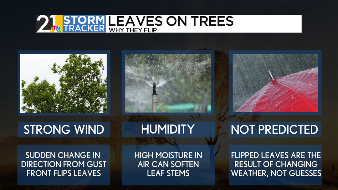 A shift in wind is just one way that leaves on trees tend to flip before storms arrive. While storms form in warm environments, they also need a humid atmosphere to get as much moisture out of it. With high humidity, this also acts to soften the stems of leaves, making the structure of the leaf easier to move and flip.