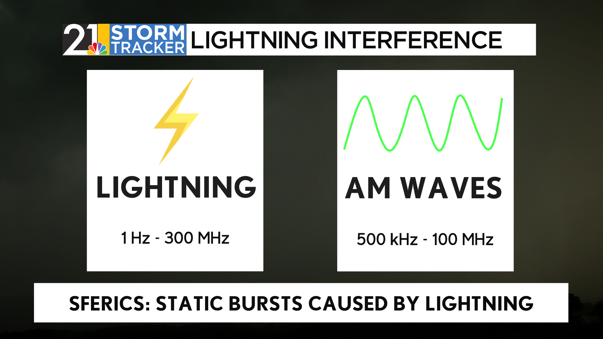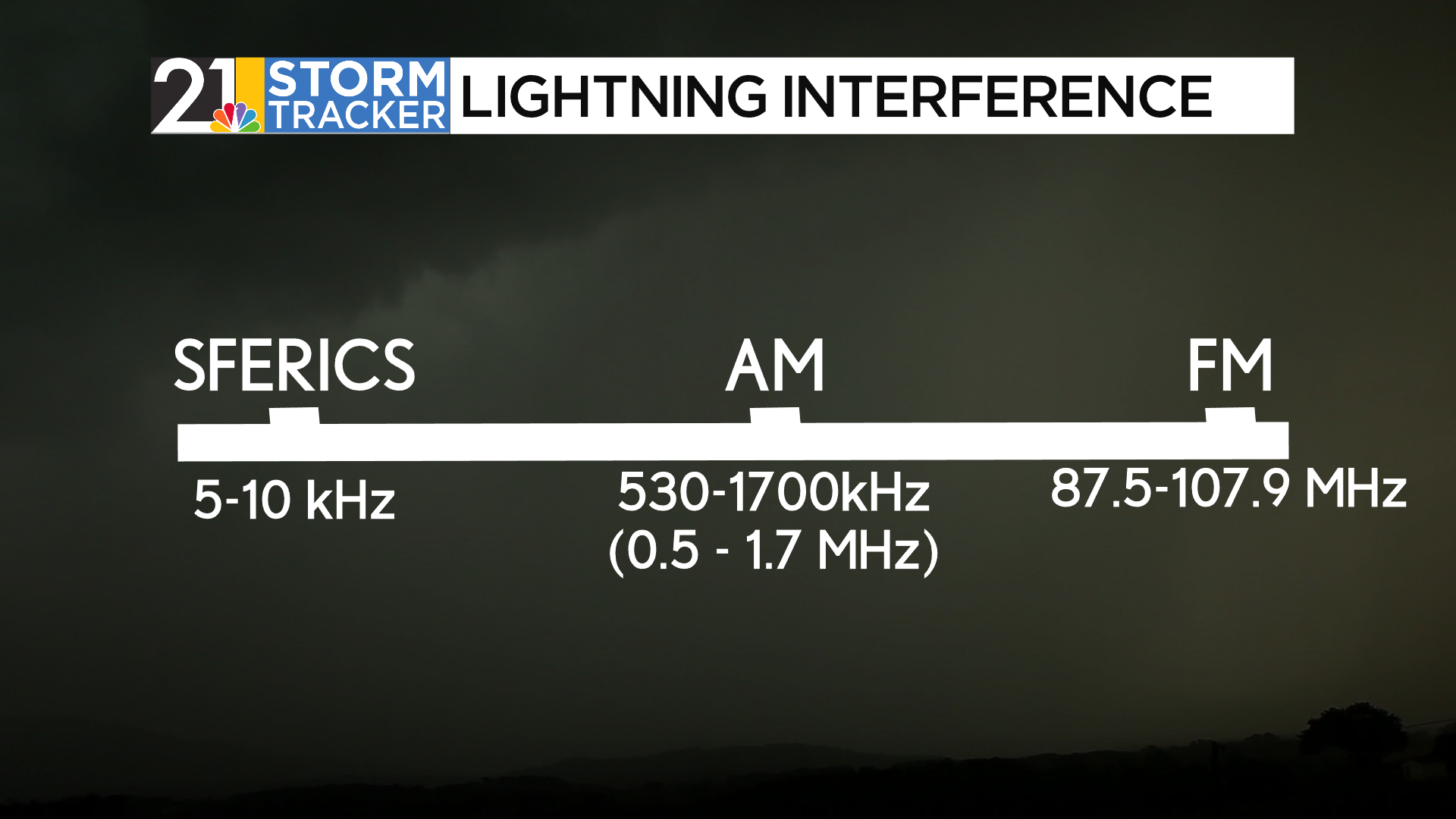 Lightning strikes can emit an incredible amount of energy. A single strike can radiate waves that bounce around the world several times before dissipating, with hundreds of megahertz of energy (MHz, or 1000 times a kHz). The strongest strikes can lead to static bursts, called sferics. These bursts can contain energy in the low kilohertz range. AM bands have a much higher frequency, close to a megahertz, but bursts this large can still easily disrupt the radio’s signal. This can cause the familiar “static” sound to play for a couple of seconds as energy from the waves ripples. As FM’s wave frequency is around 100 times higher than AM, this is not a problem with this type of radio.