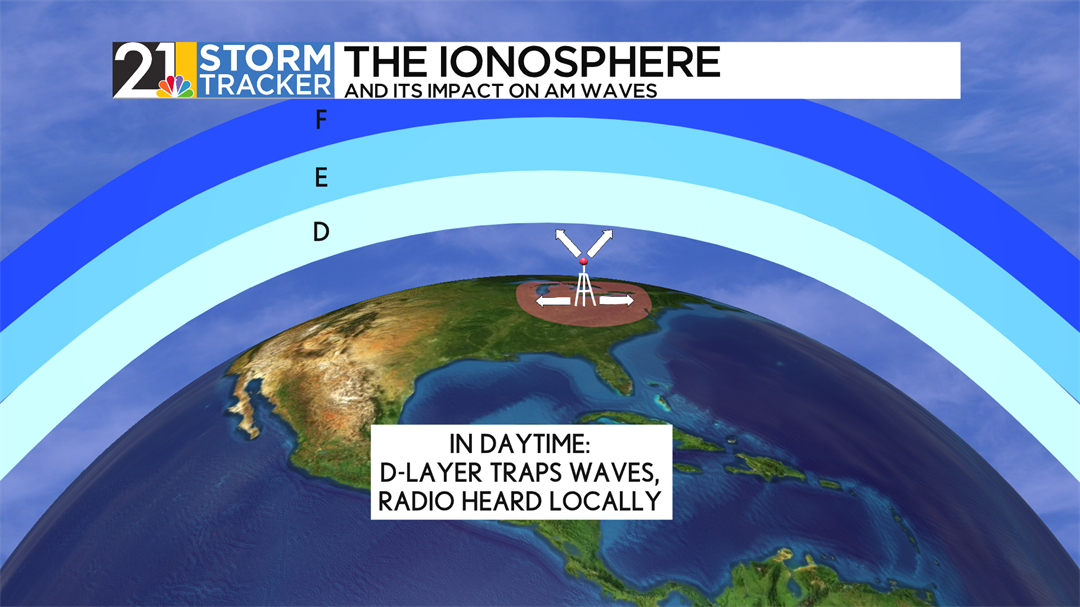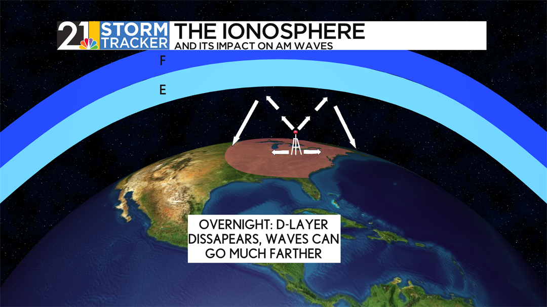 While AM radio can be interfered with by lightning, another part of the day-to-day life can enhance its quality. To figure out what it is, we need to look higher up in the atmosphere, towards Earth's ionosphere. This is a layer far above our heads, starting around 40 miles aloft. This layer is known for atoms ionizing, or exchanging electrons, with one another. The main driver for this is energy from the sun, which