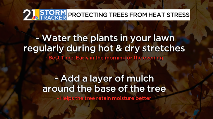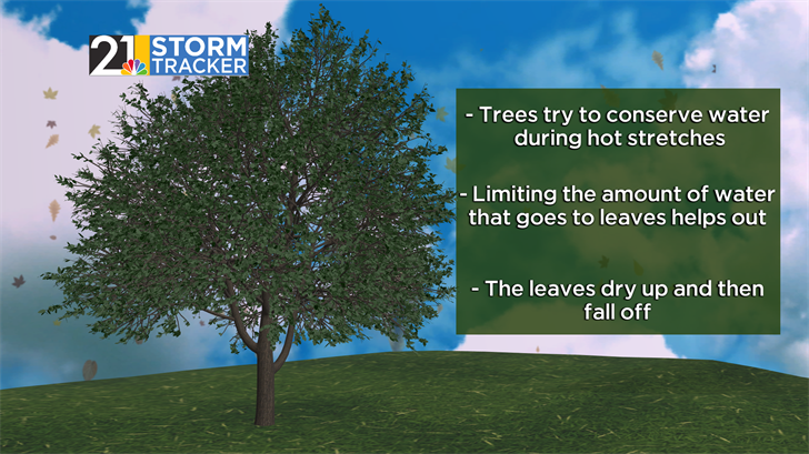 One way trees can conserve water during these hot stretches is by dropping leaves. By losing leaves, a tree can reduce its surface area exposed to the heat and can redistribute water that it would be sending to the leaves to other locations.
