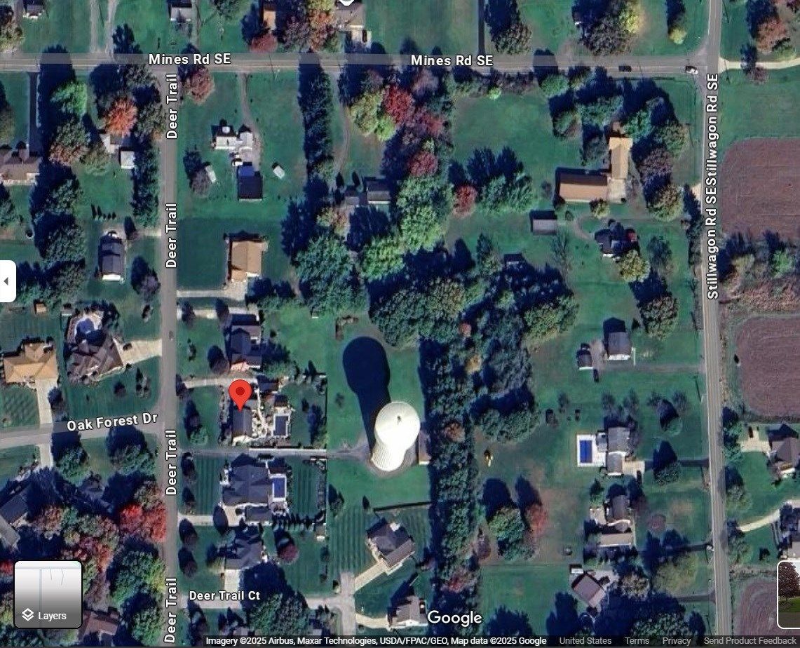 The tower is located south of Mines Road Southeast and west of Stillwagon Road Southeast.