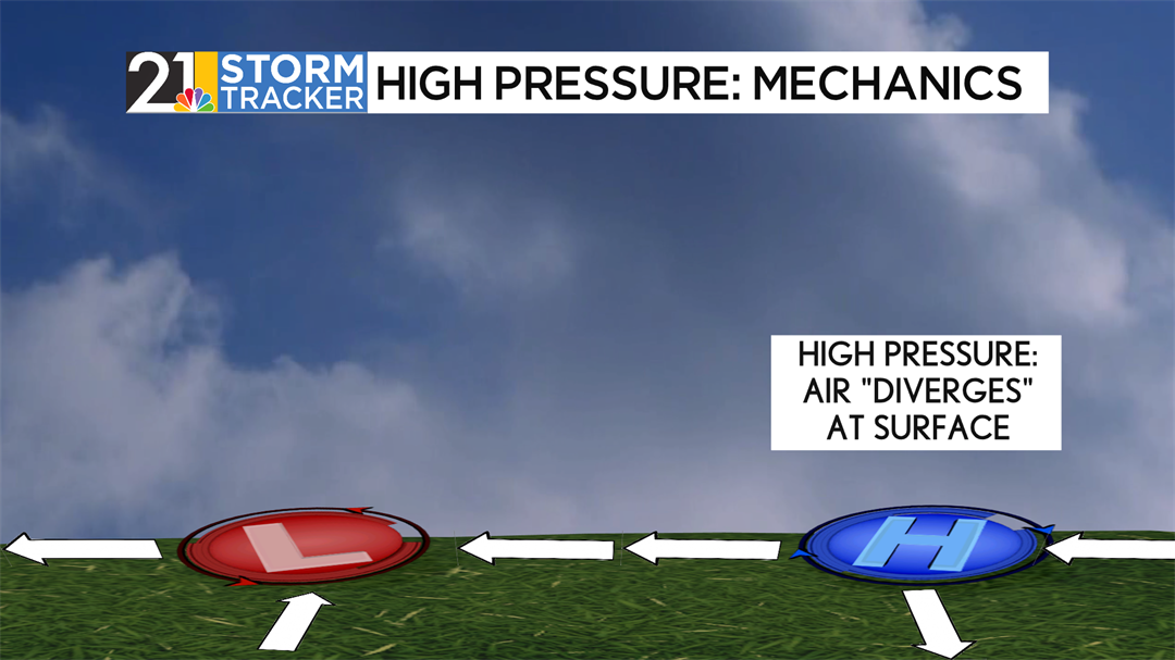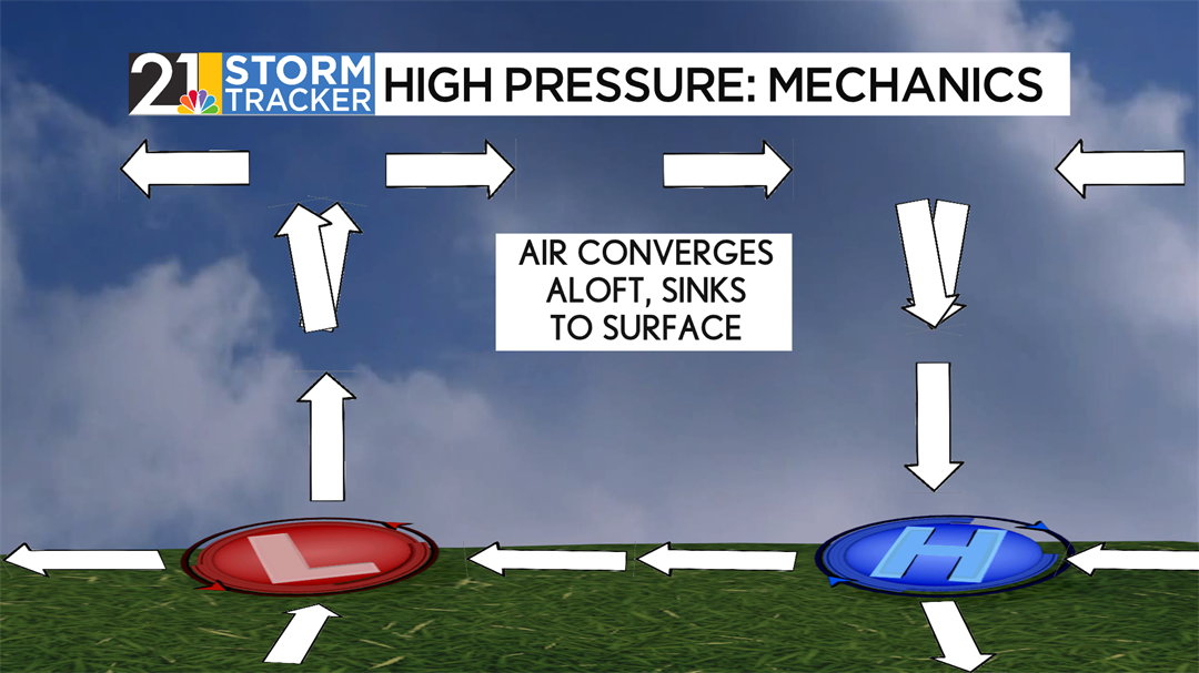 High-pressure systems feature diverging air at the surface, or air spreading away from a point in all directions. Due to the Coriolis effect, air spins clockwise around the system. This means if someone were due east of the center of a high, then they would likely experience winds from the northwest, both away from the center and in a clockwise direction. With air escaping from a point, there must be more air coming from somewhere to replenish the supply. This is how air converges, or comes together, aloft above the center of circulation, and sinks towards the center of the surface high.