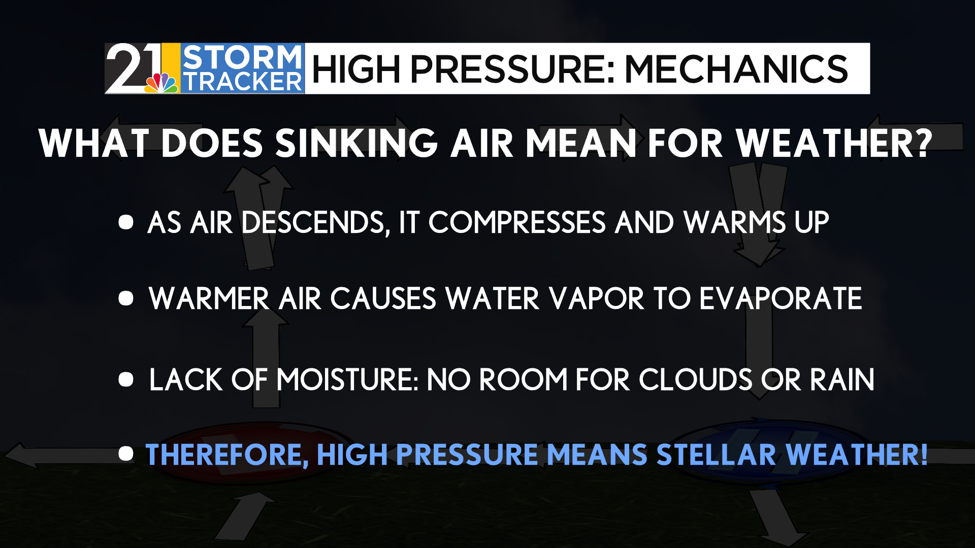 How does calm weather come from a high-pressure system, though? It all comes in the way air moves between elevations. In this case, air sinks from above, and as it sinks, pressure increases, compressing and warming the parcel of air. As the air warms, it dries out and evaporates the parcel. With dry air, there’s no room for rain, or clouds for that matter, to form. This is the basis for why dry weather can be attributed to high-pressure systems.