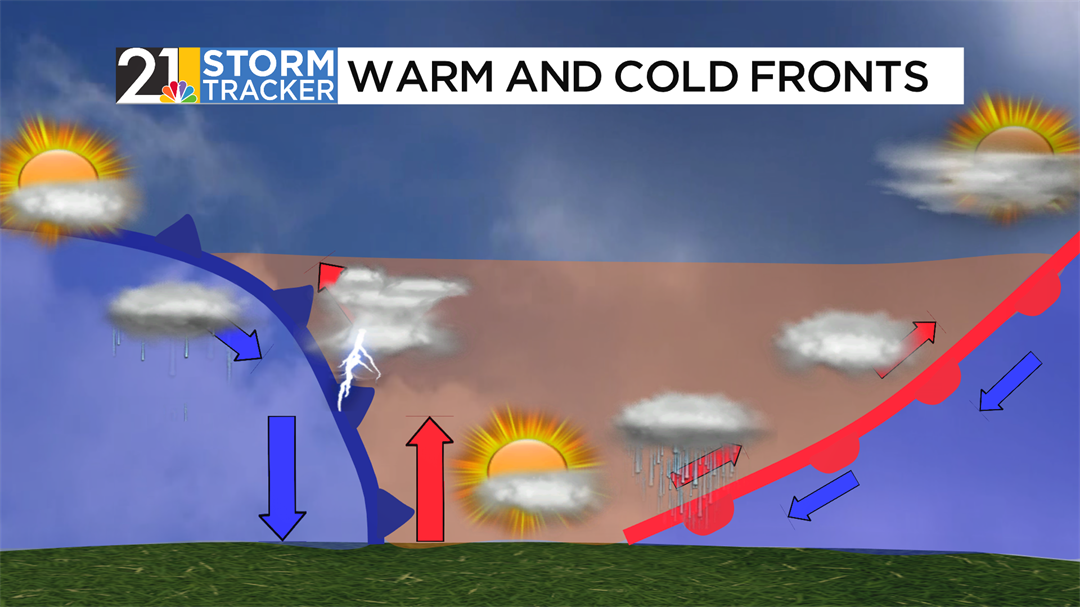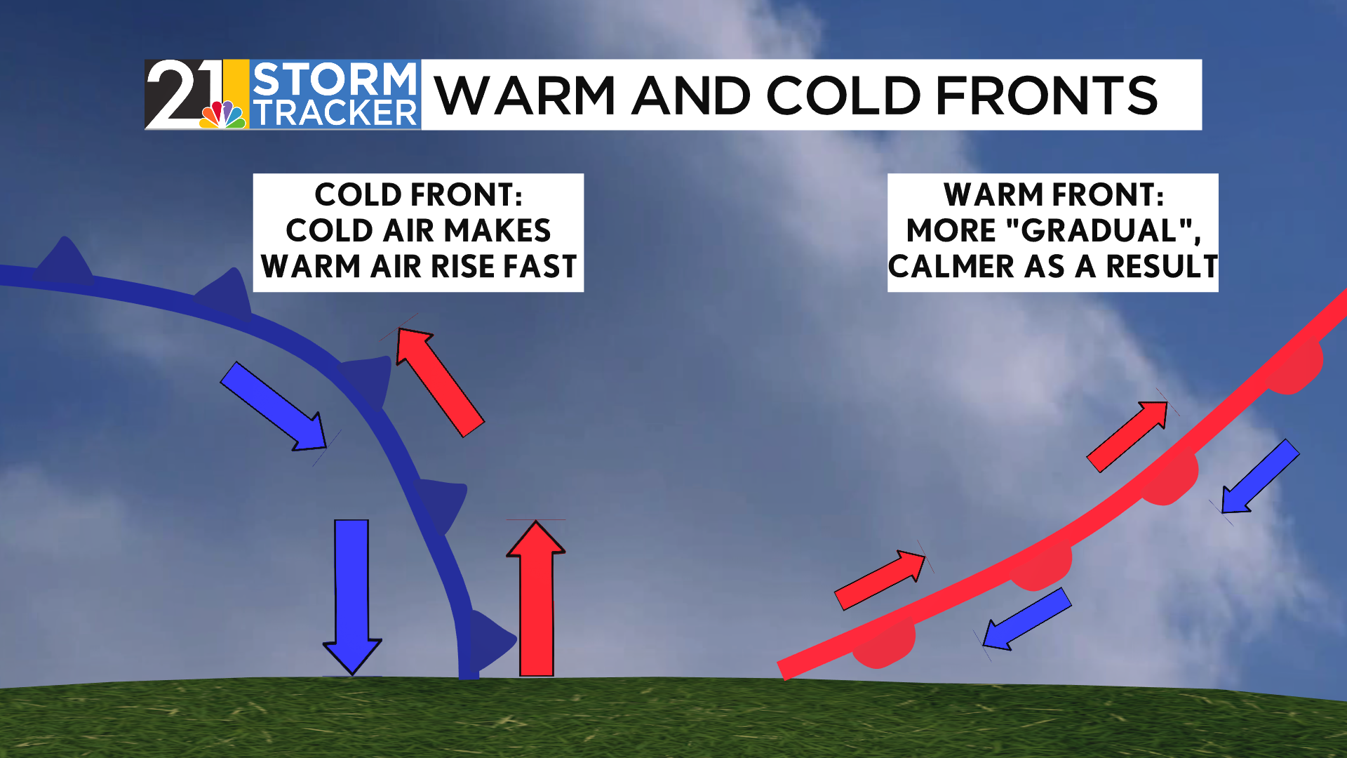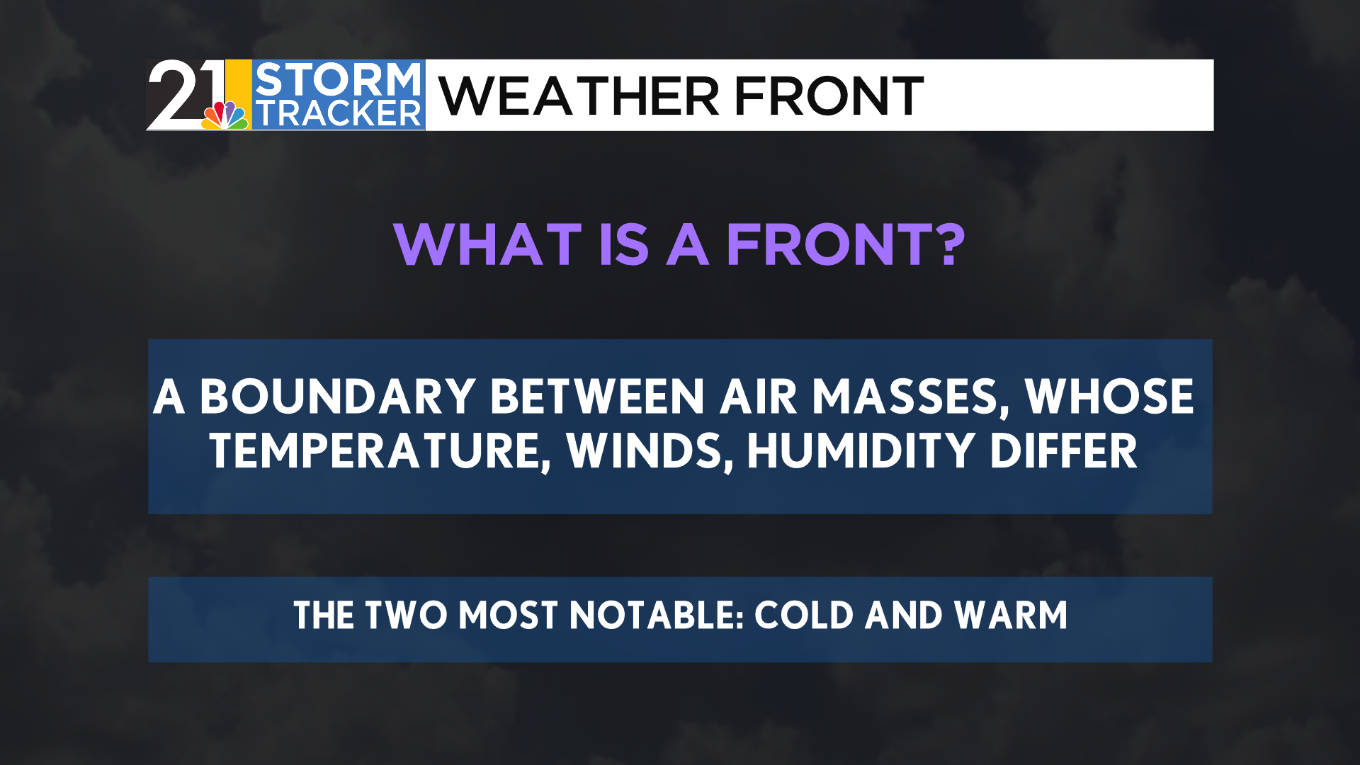 Perhaps the most common and recognizable of fronts are warm and cold. Adorned by different colors and symbols, these two visible yet invisible lines have something in common. They are both boundaries between air masses, which can delineate differences in weather variables like temperature, wind, and dew point, to name a few. A front will be stronger if the two air masses it separates are very different.