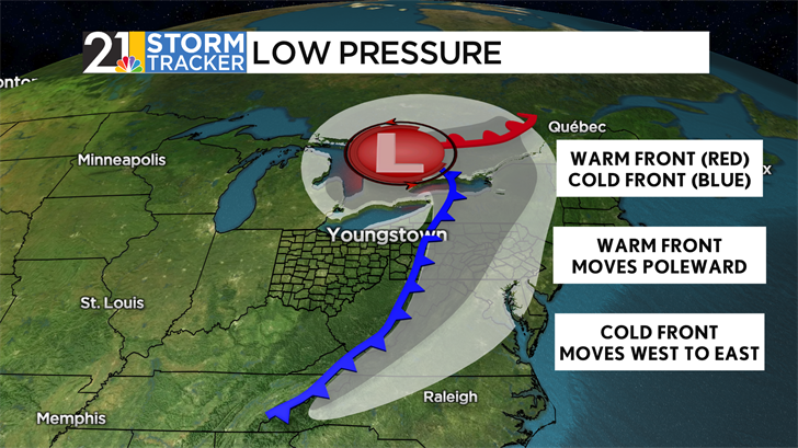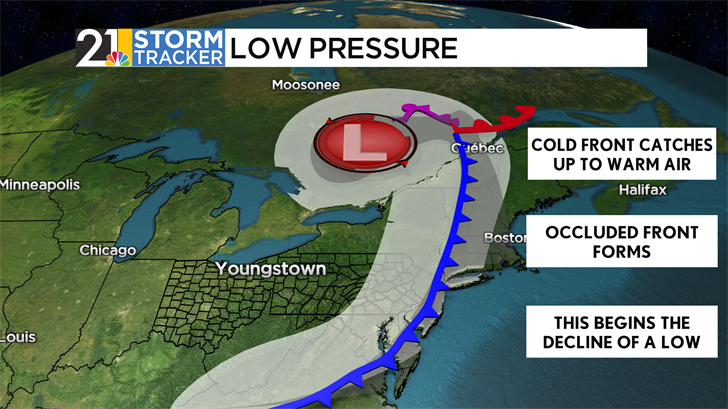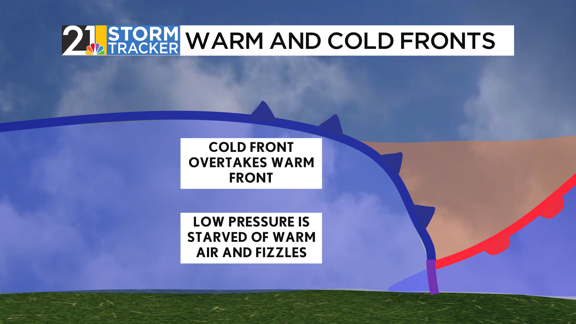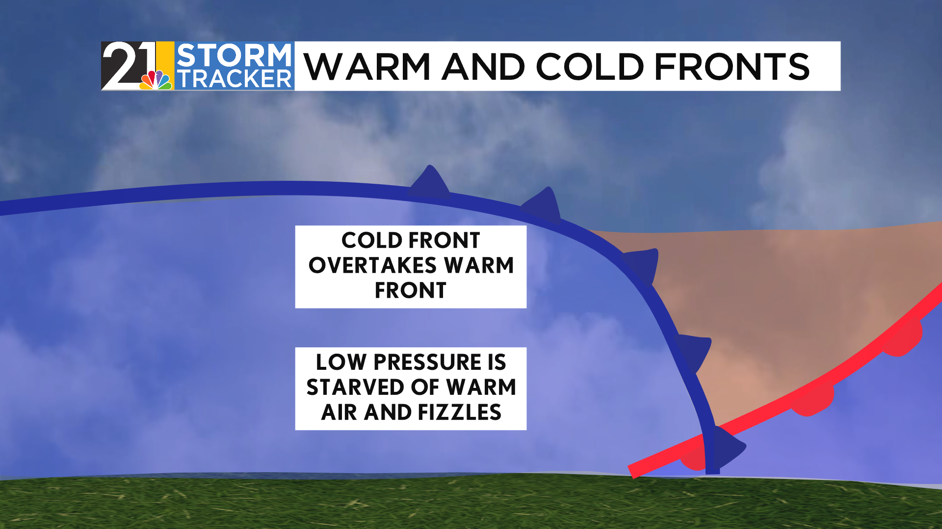 As a low-pressure system matures, cold fronts will eventually catch up to a warm front. On the ground, the “warm sector” completely disappears, as the “nose” of warm air is now restricted to being above the ground. In this case, an occluded front forms, which is the boundary between two different masses of cold air.