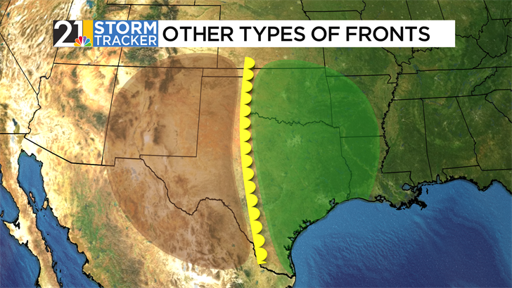 Dry lines, common in the Southern Plains, separate two different air masses whose main difference is their moisture content. They are colored either yellow or orange, with semicircles facing the moist side of the front. In the Plains, this can separate stagnant continental air masses from moist ones coming from the Gulf. This can be another way that thunderstorms can develop in this area.