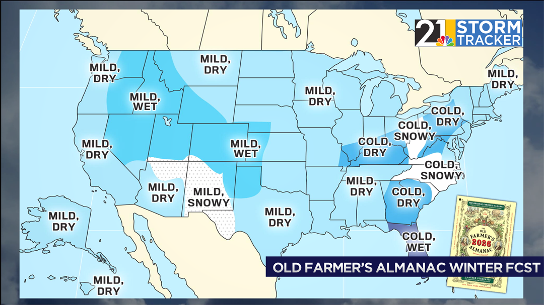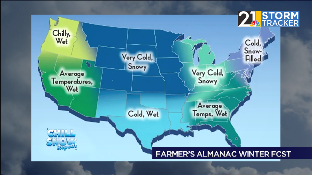 Cold and snowy conditions are a theme that has been replicated in the most recent Farmer’s Almanac map, with this designation covering all of Ohio and far Western Pennsylvania.