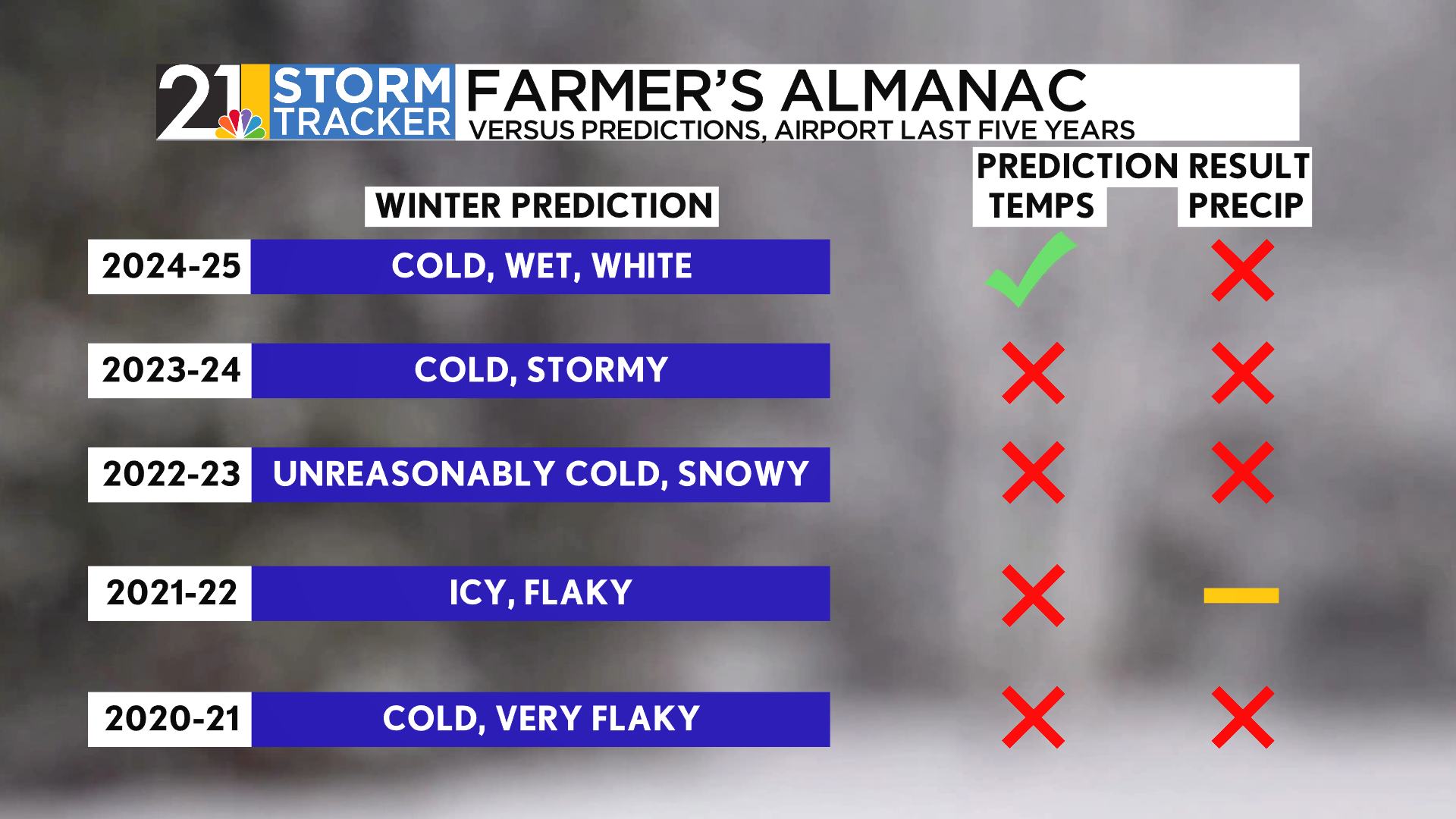 In the past five years, the Farmer’s Almanac has typically predicted winters in our neck of the woods as “cold”- a rather vague word, though for this purpose will be interpreted as an anomalously cold season. In all but one season, average wintertime temperatures actually exceeded the 30-year average. Additionally, the Farmer’s Almanac predicted “flaky” or “snowy” seasons- again, vague wording, though if interpreted as an above-average snowy or flaky season, the evidence points against the Almanac all five years at the airport, thanks to below-average snowfall all five years.