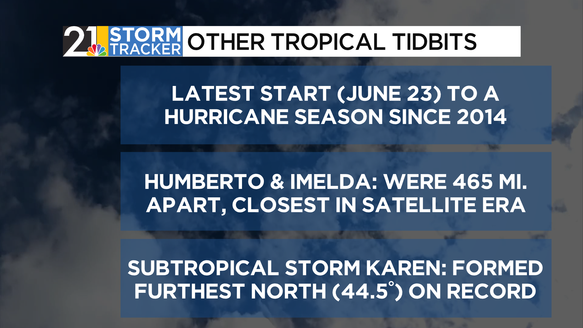 Some interesting bits of activity can also be placed in the record books. Andrea’s formation in late June was the latest start to a tropical season since 2014, when Hurricane Arthur formed as late as July 1st to eventually make landfall in North Carolina. The “twin” hurricanes of Humberto and Imelda, covered at length in a previous Weather 101 segment, ended up being just under 500 miles apart from one another at one point, breaking records since at least 1960. Their “atmospheric dance” in the Fujiwhara effect was the first documented case of this in the Atlantic since 2016.