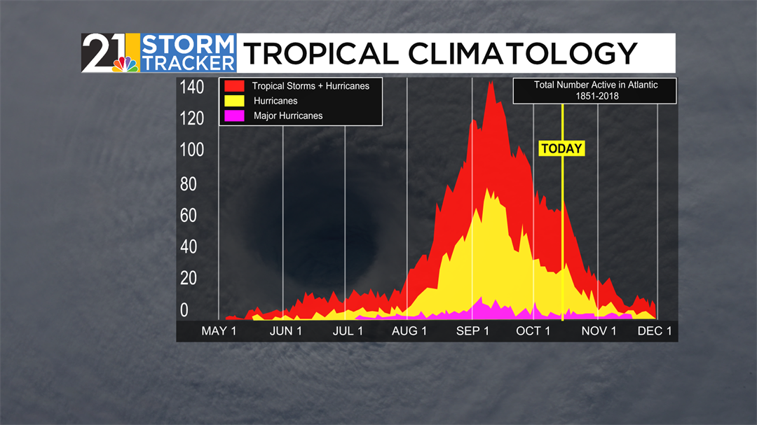 Though the weather in our neck of the woods has significantly cooled off, it takes longer for ocean water to do the same. For this reason, there's about 15% more hurricane season activity after today's date. For the next seven days, though, the National Hurricane Center has not noted any specific areas they are watching for development.
