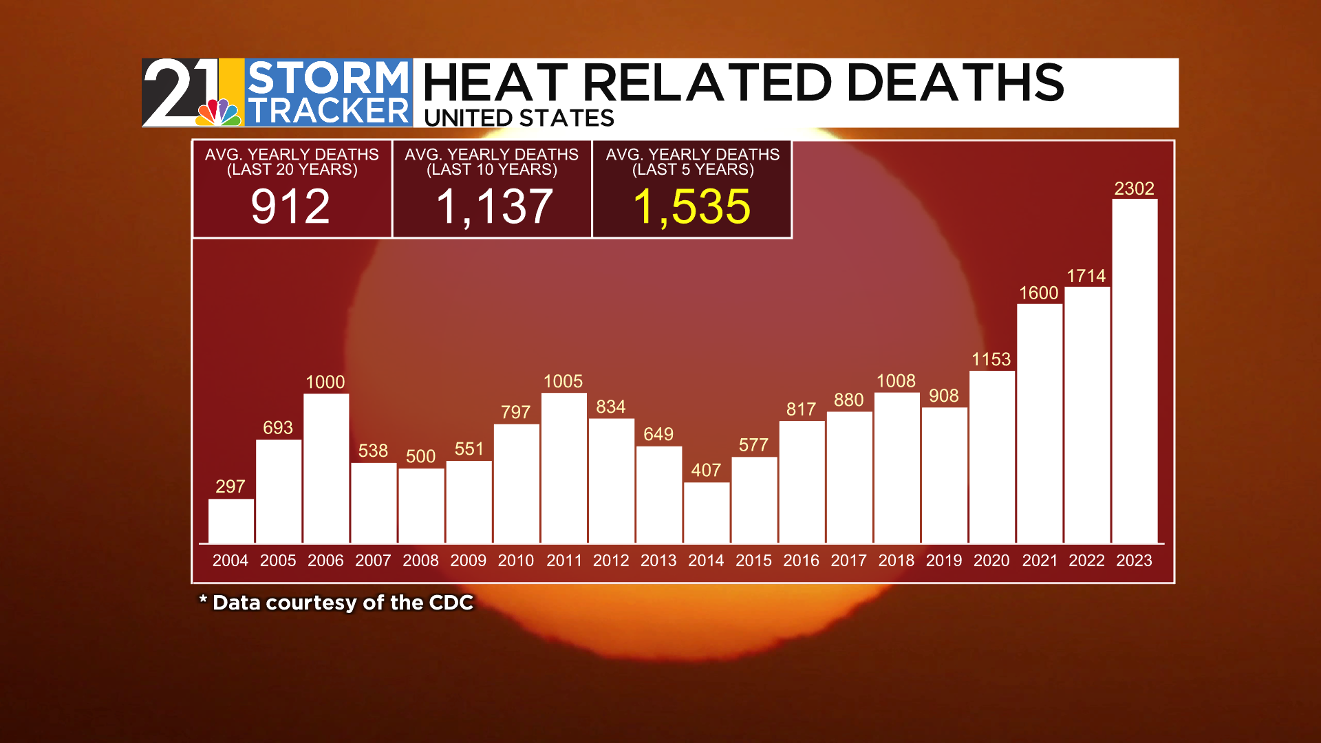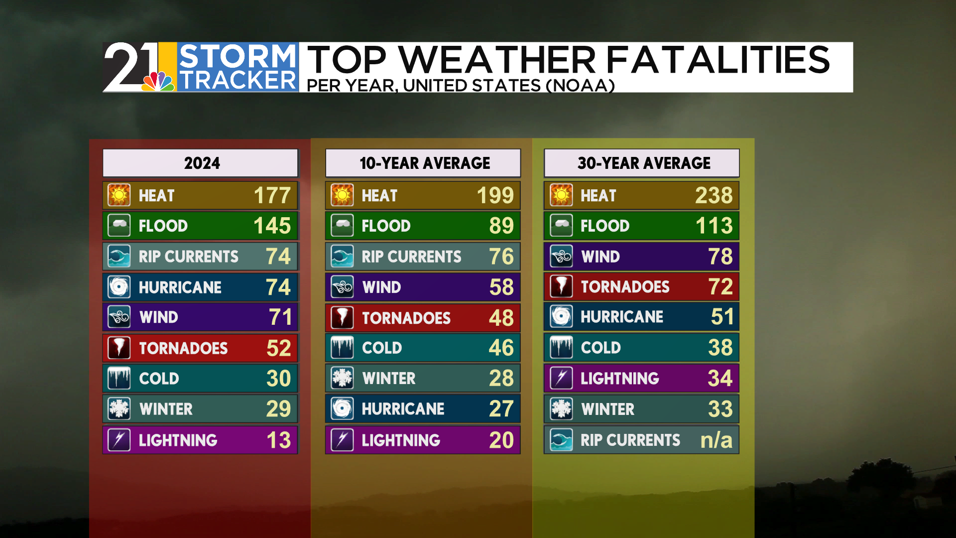 Heat has been the most common killer for several years. Compared to other sudden weather events, such as hurricanes, tornadoes, and thunderstorms, extreme heat can be disregarded by many. Heat can also exacerbate many underlying health concerns. Last year, “heat-related” deaths (as classified by doctors across the 50 states and Washington, D.C.) totaled over 2,300 in 2023, an all-time high. This number has been steadily rising over the last ten years, with a 20-year average of just over 900 deaths.