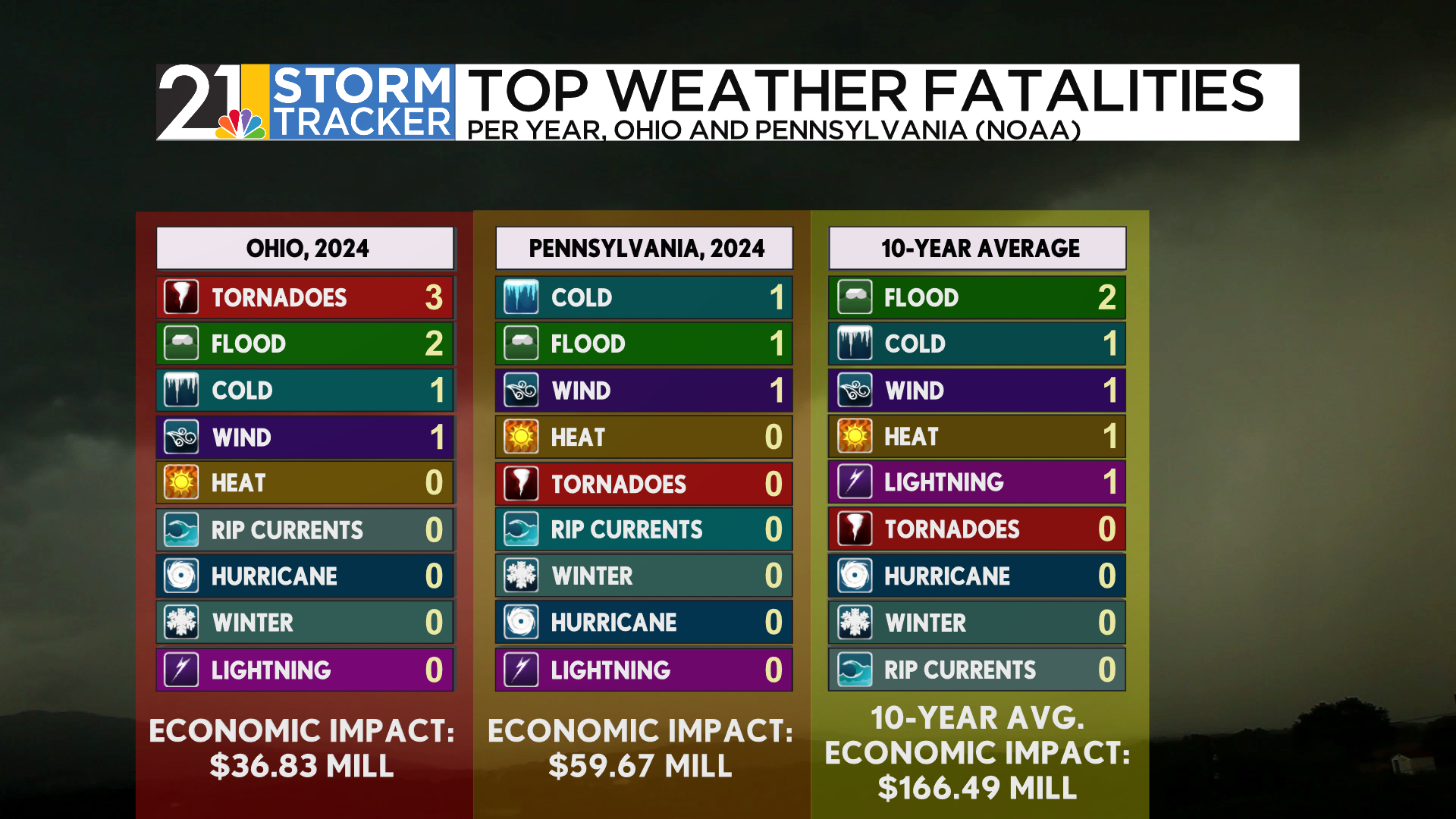 Tornadoes were the leading cause of death in the Buckeye State last year, thanks to an EF-3 tornado that tracked in Auglaize and Logan Counties, South of Toledo. This was a rare sight, though, as tornado deaths are quite rare in both Ohio and Pennsylvania. Floods kill an average of two people per year in both states, with heat, frigid cold, lightning deaths, and wind also capable of ending people’s lives. Direct hurricane and rip current deaths are not expected or commonly seen in either state.
