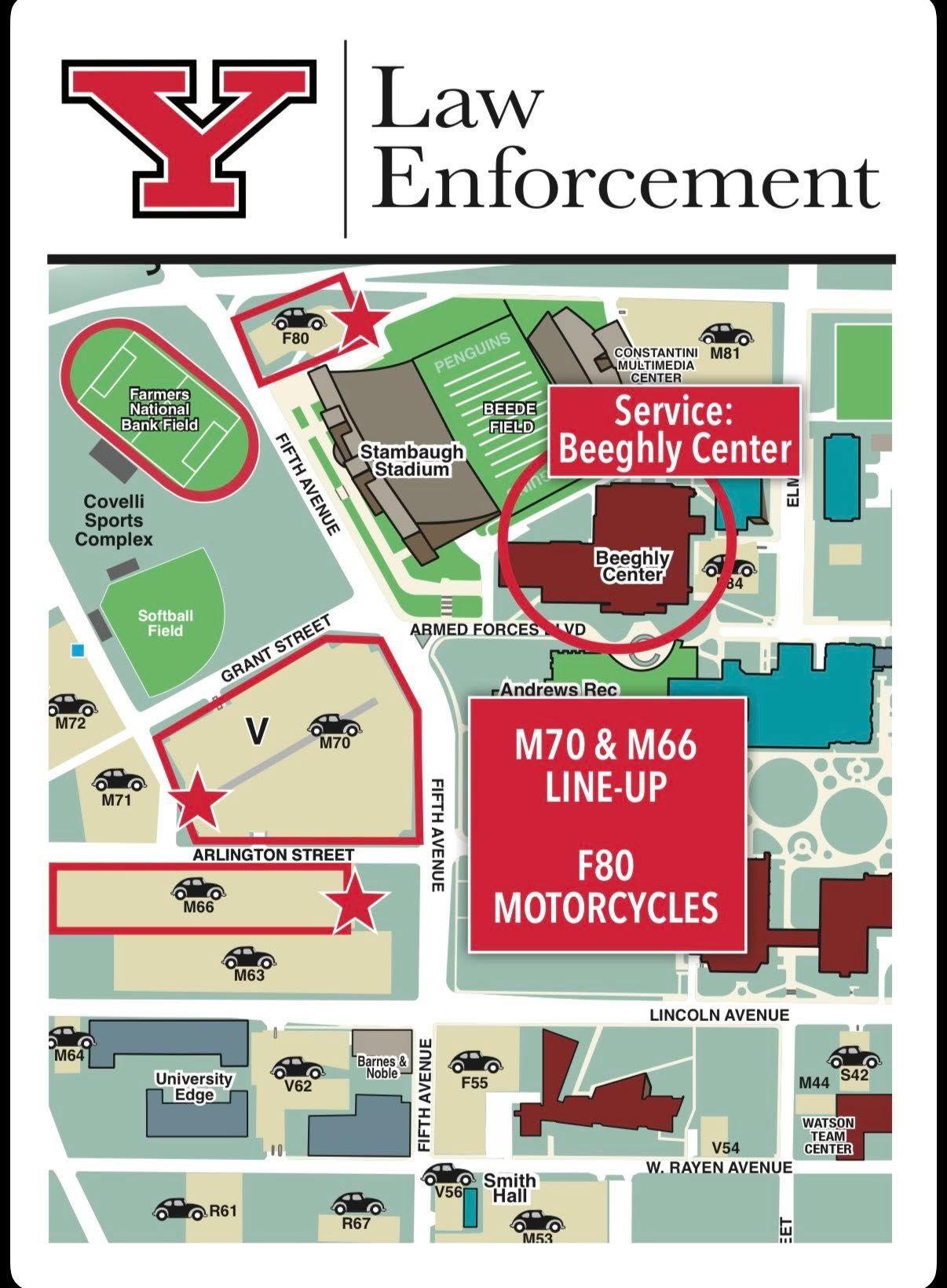 Law enforcement attendees are directed to use the M70 and M66 lots for vehicle line-up and should check with event staff or YSU Police upon arrival for any specific instructions regarding procession or staging.