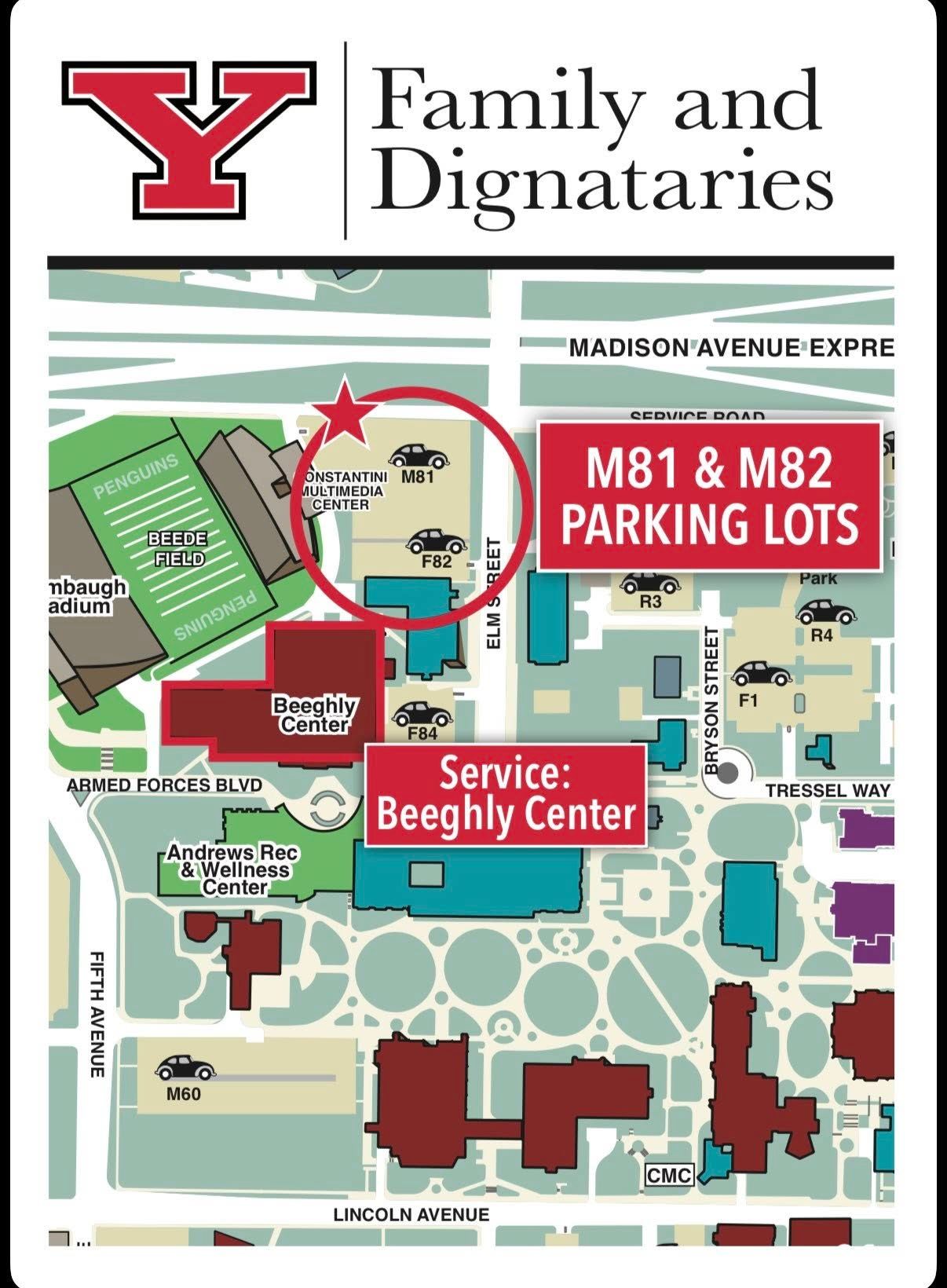 Parking for family members and dignitaries is located closest to the Beeghly Center. Designated parking lots are M81 and M82.