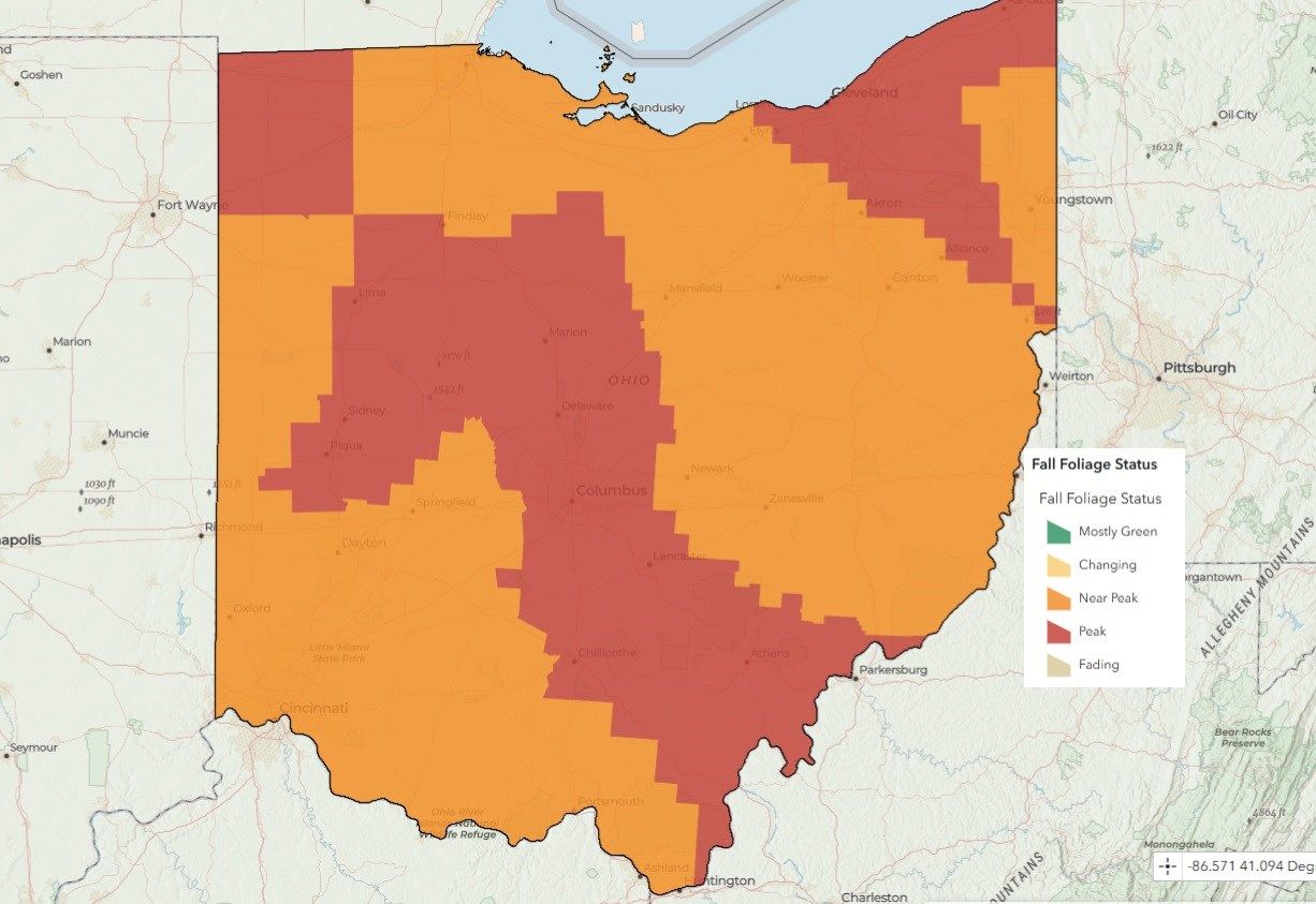 "The colors of the autumn season are now evident across the state with 'near peak' and 'peak' conditions statewide," said ODNR Fall Color Forester David Parrott in a release accompanying the update.