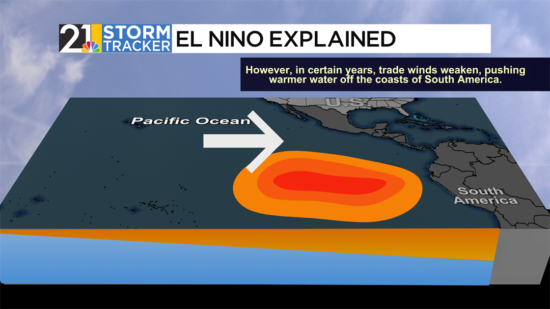 Trade winds become weaker in El Niño scenarios. With weaker winds, less water is pushed away from the coast, leaving a large area of stagnant water that can heat up quickly. As a result, sea surface temperatures become higher than average.