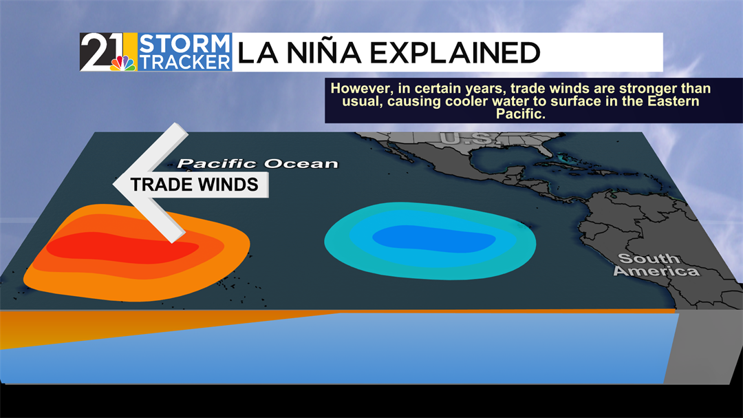 Stronger-than-usual trade winds can cause La Niñas to form. When more fierce winds blow across the Pacific, more water is carried out towards Asia. This means that a greater amount of water must be heated along the same surface area compared to El Niños. Additionally, strong, constant wind can cause upwelling, which is deeper, cooler water rising to replace warm water from the surface. These two factors can cause sea surface temperatures to be below average for a time.