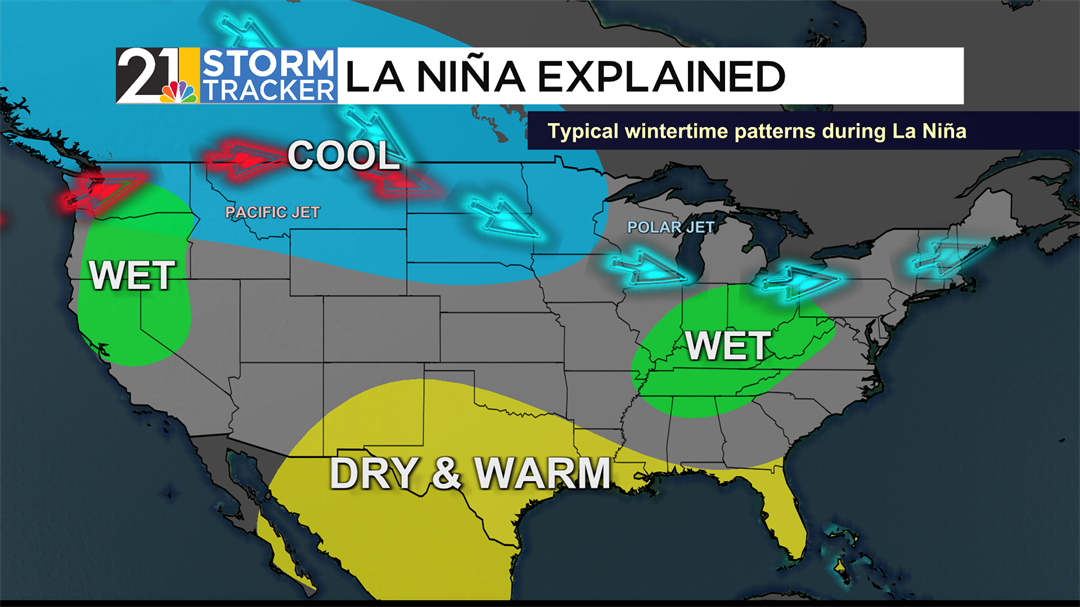 La Niñas act to close the gap between the two jet streams across the United States. The Pacific jet stream, in red above, gets pushed farther north, while the Polar Jet Stream gets pushed south, allowing the northern tier of the country to get colder than average. Winters within the Valley tend to be drier than average under La Niña conditions.
