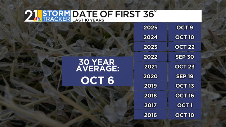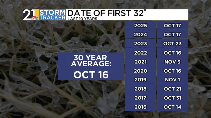 As warmth transitions to chill, our region typically sees its first temperature drop close to freezing in the month of October. The first frost came just a tad later than usual, as high pressure dropped temperatures to 34°F on the morning of October 9th. This is three days later than the 30-year running average.