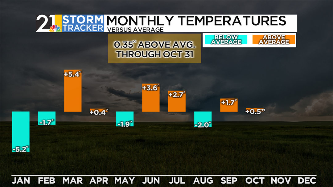 Officially, the airport’s average temperature for the month was 52.7°F. Each day's observed high and low temperatures are taken into account. This is 0.5°F above the average October temperature of 52.2°F. The month is the second straight to finish above-average, as well as the fourth in five.