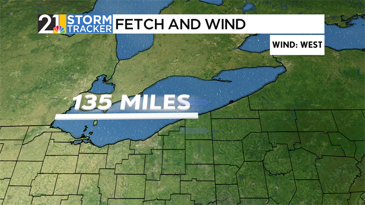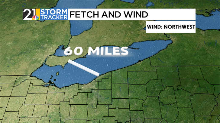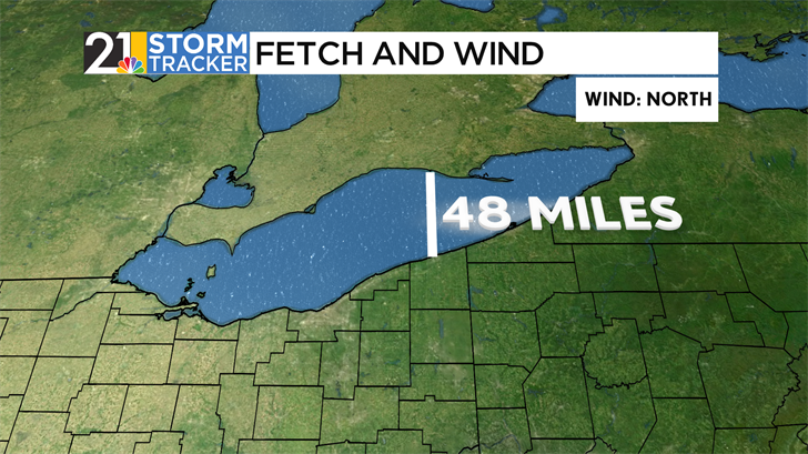 Consider today’s setup, with winds blowing from the North. If this wind were to go coast-to-coast into our area, its fetch over Lake Erie would be just shy of 50 miles. While rather far, this is not the furthest it can go.