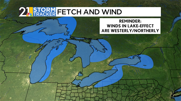This is why fetch, or the distance that winds blow unobstructed over water, is another important variable to know in lake-effect forecasting. In simpler terms, fetch describes how long the wind will go from coast to coast on a lake.