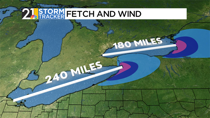 The same scenario exists on Lake Ontario, as the lake’s alignment is roughly the same as that of Erie. Winds blowing just south of West can have a fetch of 180 miles, giving towns like Syracuse, Oswego, and Watertown, NY, very impactful events when the wind sets up just right.