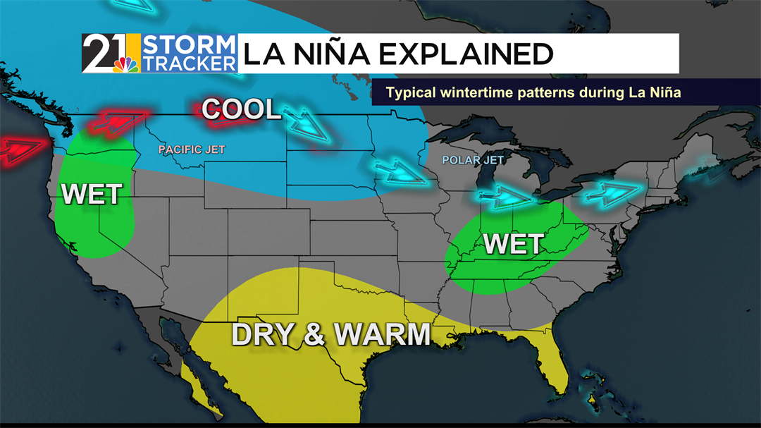 The most well-known phenomenon is ENSO, short for the El Niño Southern Oscillation. Between its two phases, El Niño and La Niña, Earth is currently in a La Niña. This occurs when waters off South America cool below average due to stronger-than-usual trade winds (Learn more about ENSO here). La Niñas move the polar jet stream south, allowing the northern tier of the country to get colder than average. Its position closer to the Valley allows our winters to be wetter than average, though with no big impact on our temperatures.