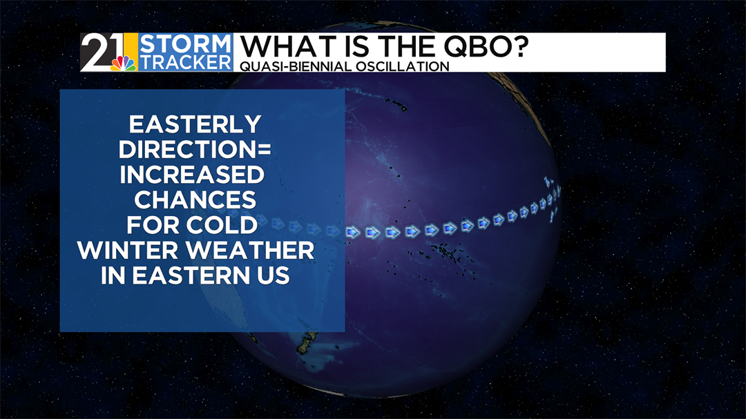 Some analogs allow us to go high up in the atmosphere. The QBO, or the Quasi-Biennial Oscillation, is the change in stratospheric wind movement- simply how the wind moves between 10 and 30 miles above us, at the equator. The wind direction cycles between moving West and East every year or so. If winds were moving west during our winters, this has been shown to make the weather a bit milder in our region. East-moving winds increase our chance for colder winter weather. Currently, the QBO is in a very strong easterly phase, which suggests that very chilly weather is possible, especially if the phase stays put throughout the winter. While suggesting significant chill, there is no direct link to precipitation departures.