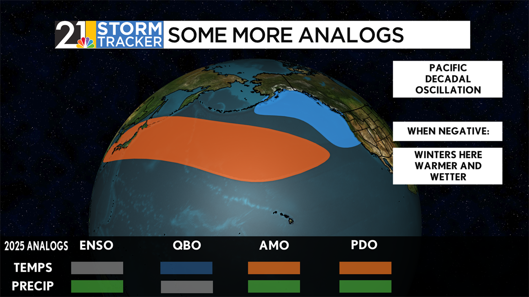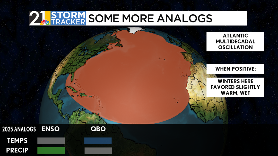 Several other analogs examined are based on sea surface temperatures and their behavior. The Atlantic Multidecadal Oscillation, or AMO, is a cyclic change of Atlantic waters over the course of many years, hence the name. This analog inspects the entire North Atlantic Ocean and its temperature departure. The AMO has been positive for the last five years, and with only brief interruptions since 2000. Within the Valley, winters are favored to be slightly warmer and wetter, compared to a negative AMO, where winters are still warm, though without too much confidence in terms of precipitation.