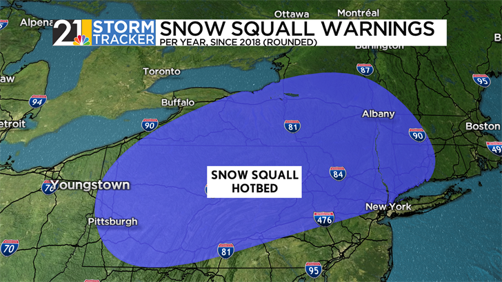 The “bullseye” of snow squall activity, for that reason, is largely centered within New York and Pennsylvania. While cities just off the Great Lakes, such as Buffalo and Erie, as well as major Northeast cities such as New York, Philadelphia, and Boston, are not hotbeds, major Interstate Highways can be routinely affected. Drivers on I-80, I-76, I-81, and I-79 within Pennsylvania (to name just a few) must take extra precautions during the winter months in case of squalls.