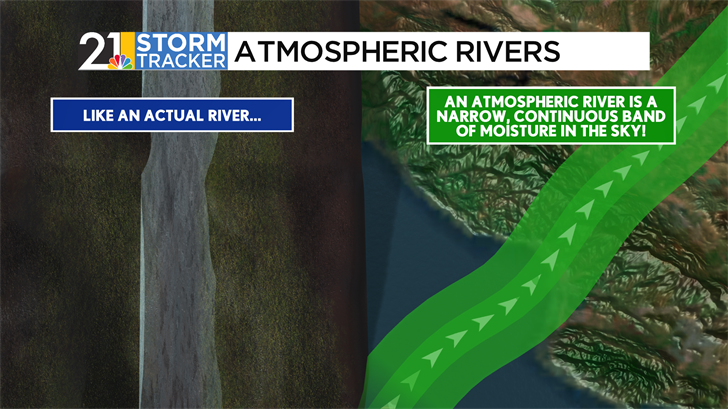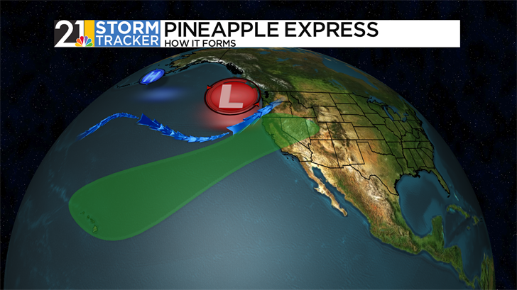 On satellite presentation, atmospheric rivers look like "conveyor belts” of moisture. Low pressure to the north drags the narrow band of moisture from the warm, sultry tropics up to the Pacific Coast.