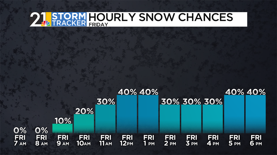 Snow showers will continue to visit eastern Ohio and western Pennsylvania late Friday night into Saturday, and the result will likely be a new inch or two of snow on the ground by the end of the day Saturday. A heavier snow squall is also possible during the first half of the weekend. Sunday will be a quieter day, but the air mass overhead will be similar to Thursday's: temperatures will mostly be in the teens.