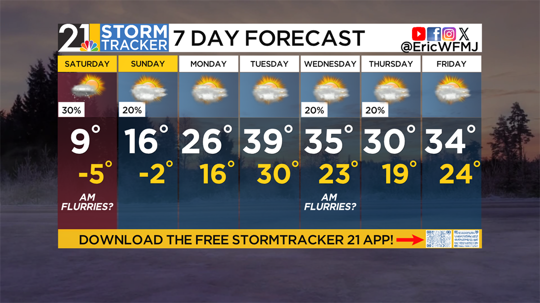 The arctic cold front that produced a round of snow showers Friday evening will be well to the east of the area during the first half of the weekend, but the Siberian cold is here for a couple of days. Some snow flurries can linger for a while, especially in areas north and east of Youngstown. We expect wind chill values to stay below zero throughout the day.