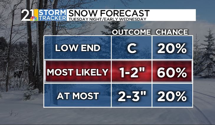 After a few morning flurries, Tuesday will feature some afternoon sunshine with high temperatures colder again in the low 30s. Winds will pick up tonight as a widespread swath of snow works into the area around and shortly after midnight. Snow will taper to flurries before completely tapering off before noon on Wednesday. 1 to 2 inches of new snow accumulation will be possible overnight into Wednesday morning.